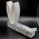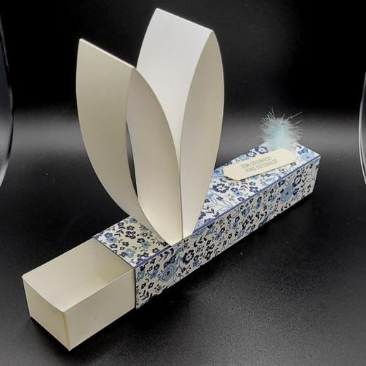 Die Schiebeschachtel ist aus ausgesuchten Designerpapier handgefertigt, zwei Osterhasenohren zieren die Oberseite der Verpackung, ebenso ein kleiner Spruch und einer Feder.