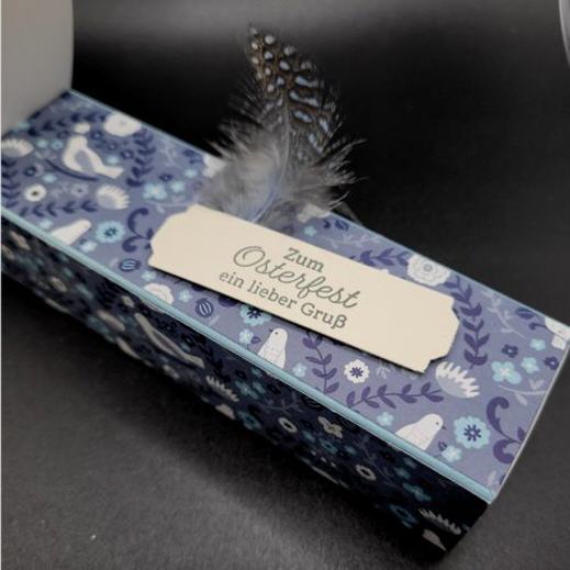 Die Schiebeschachtel ist aus ausgesuchten Designerpapier handgefertigt, zwei Osterhasenohren zieren die Oberseite der Verpackung, ebenso ein kleiner Spruch und einer Feder.