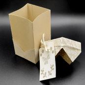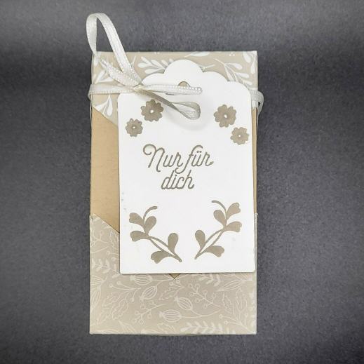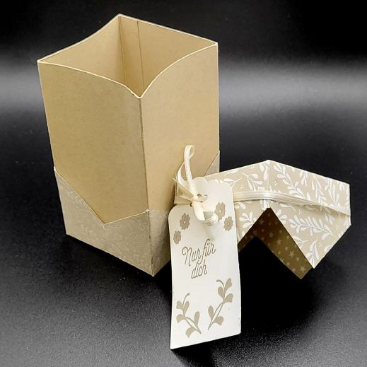 Die Box hat einen Stülpdeckel und einen gestempelten Anhänger.