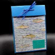 Ovale Verpackung in Handarbeit aus Designerpapier hergestellt mit einem transparenten Stoffbeutel.