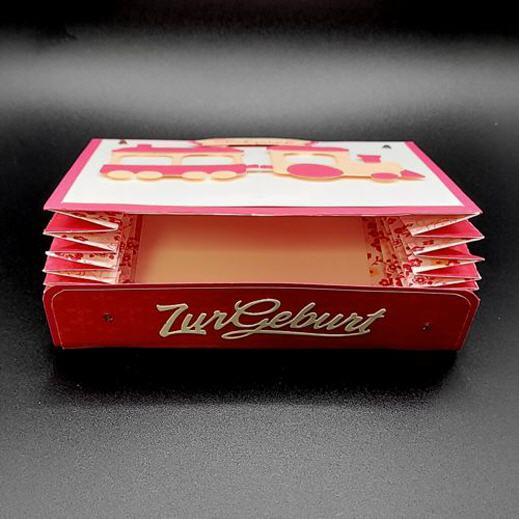 Die Karte zur Geburt hat als Motiv eine Eisenbahn auf der Vorderseite, zugehalten wird die Fächerkarte mit einem Magneten.
