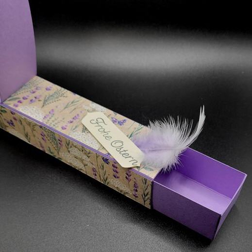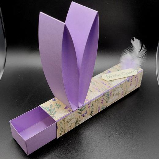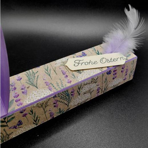 Die Schiebeschachtel ist aus ausgesuchten Designerpapier handgefertigt, zwei Osterhasenohren zieren die Oberseite der Verpackung, ebenso ein kleiner Spruch und einer Feder.