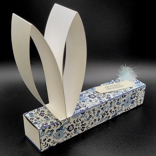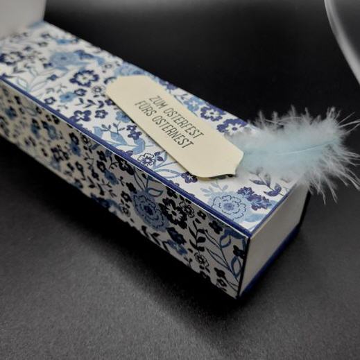 Die Schiebeschachtel ist aus ausgesuchten Designerpapier handgefertigt, zwei Osterhasenohren zieren die Oberseite der Verpackung, ebenso ein kleiner Spruch und einer Feder.