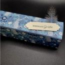 Die Schiebeschachtel ist aus ausgesuchten Designerpapier handgefertigt, zwei Osterhasenohren zieren die Oberseite der Verpackung, ebenso ein kleiner Spruch und einer Feder.
