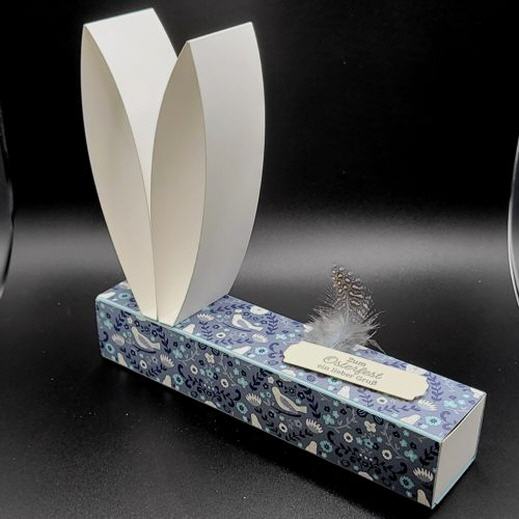 Die Schiebeschachtel ist aus ausgesuchten Designerpapier handgefertigt, zwei Osterhasenohren zieren die Oberseite der Verpackung, ebenso ein kleiner Spruch und einer Feder.