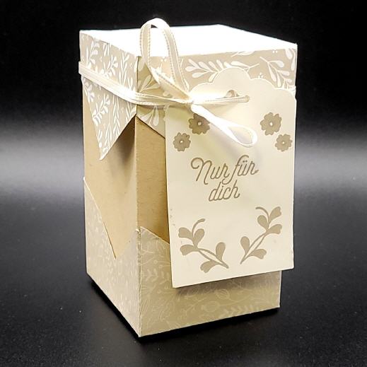 Die Box hat einen Stülpdeckel und einen gestempelten Anhänger.