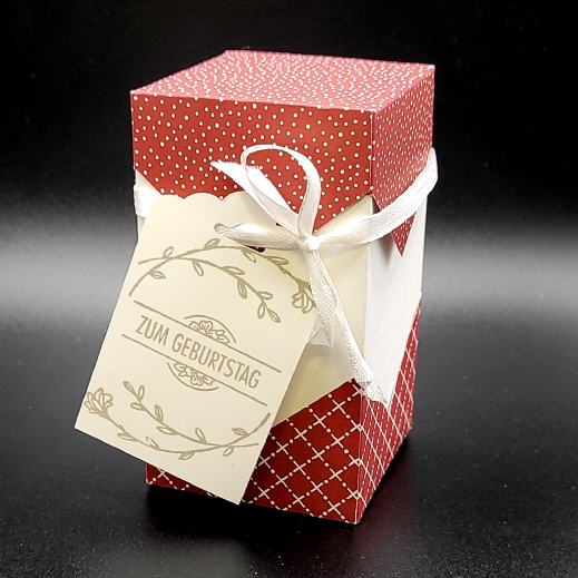 Die Box hat einen Stülpdeckel und einen gestempelten Anhänger.
