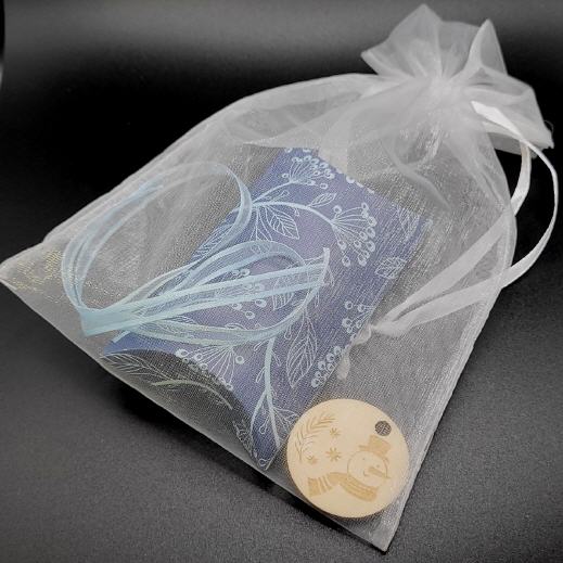 Ovale Verpackung in Handarbeit aus Designerpapier hergestellt mit einem transparenten Stoffbeutel.