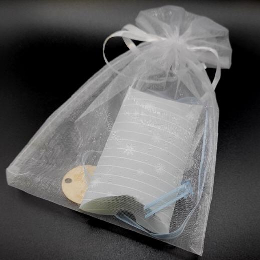 Ovale Verpackung in Handarbeit aus Designerpapier hergestellt mit einem transparenten Stoffbeutel.