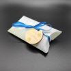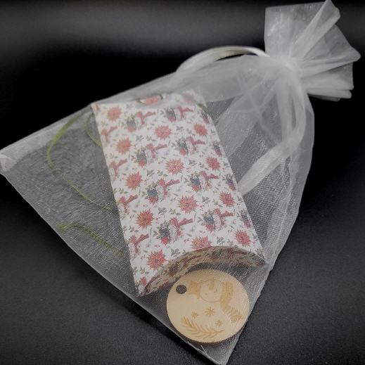 Ovale Verpackung in Handarbeit aus Designerpapier hergestellt mit einem transparenten Stoffbeutel.