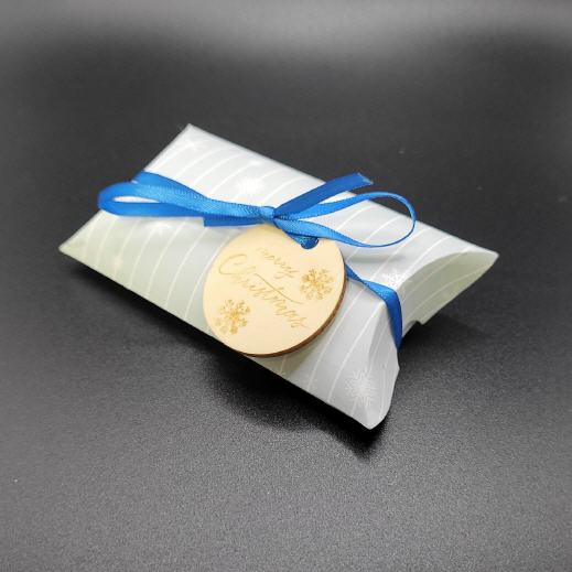 Die ovale Box zum befüllen mit Bändchen, Holzanhänger und einem transparenten Stoffsäckchen eignet sich durch seine Abmessungen hervorragend um eine größere Kleinigkeit zu Verpacken.