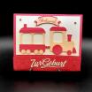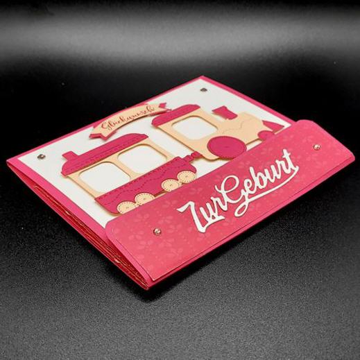 Die Karte zur Geburt hat als Motiv eine Eisenbahn auf der Vorderseite, zugehalten wird die Fächerkarte mit einem Magneten.