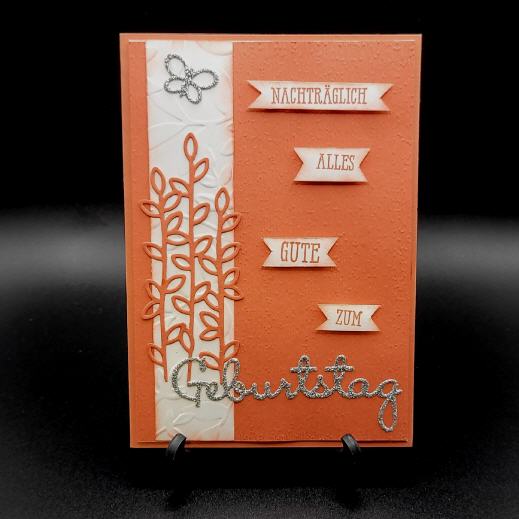 Gestaltete Geburtstagskarte mit dem Text, "Nachträglich alles gute zum Geburtstag"