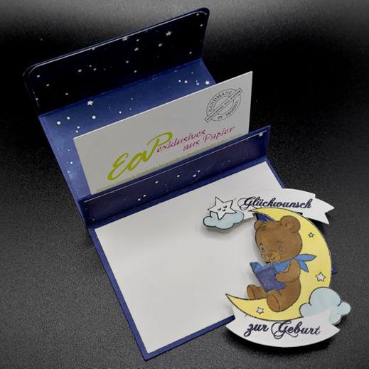 Zugehalten wird die Karte von einer Banderole mit ausgestanztem Motiv, ebenfalls aus hochwertigem Papier.