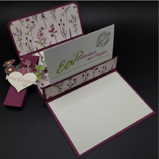 Die Gutscheinkarte hat ausgeklappt im inneren eine Einsteckmöglichkeit für die unterschiedlichsten Gutscheine im Visitenkarten- oder Scheckkartenformat.